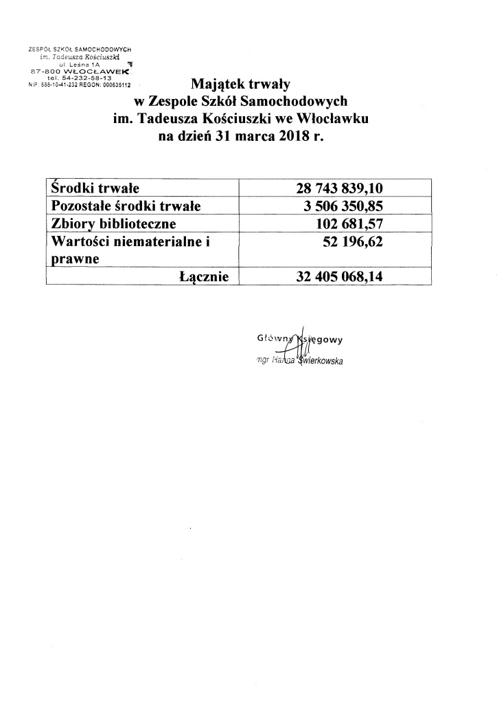 | Majątek Zespołu Szkół Samochodowych im T. Kościuszki we Włocławku na rok 2018 | dodany: 12:25, 24.04.2018 | przez: Konrad Adamczewski | |