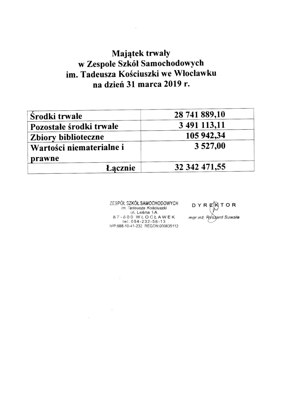 | Majątek Zespołu Szkół Samochodowych im T. Kościuszki we Włocławku na rok 2019 | dodany: 12:02, 12.02.2020 | przez: Konrad Adamczewski | |