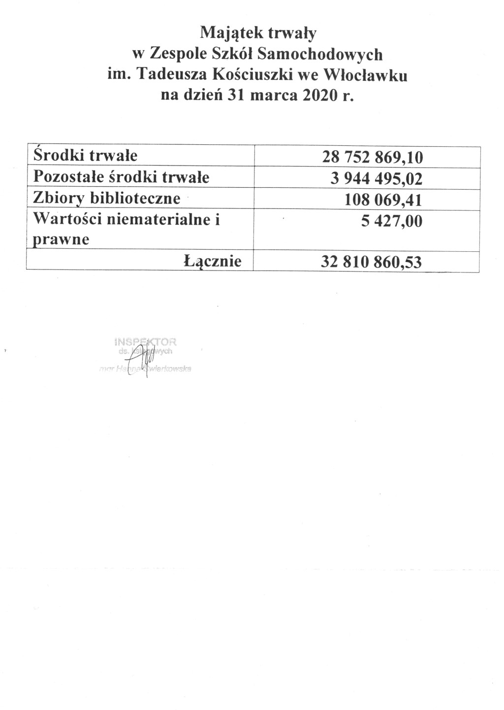 | Majątek Zespołu Szkół Samochodowych im T. Kościuszki we Włocławku na rok 2020 | dodany: 12:50, 08.01.2021 | przez: Konrad Adamczewski | |