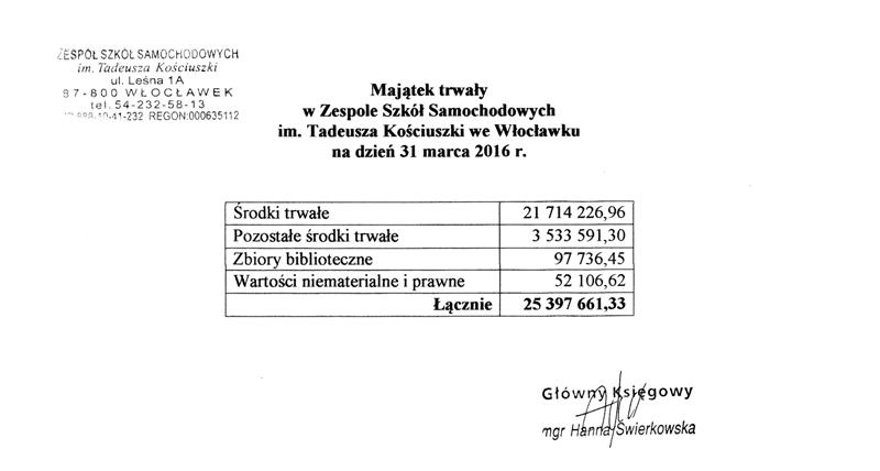 | Majątek Zespołu Szkół Samochodowych im T. Kościuszki we Włocławku na rok 2016 | dodany: 15:08, 29.06.2016 | przez: Konrad Adamczewski | |